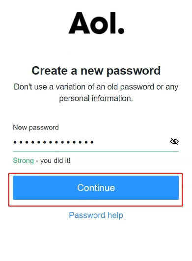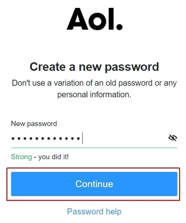 6. Nun werden Sie aufgefordert, ein neues Passwort zu erstellen. AOL bewertet automatisch, ob es stark genug ist oder nicht. Um eine wirklich unzerbrechliche Symbolsequenz zu erstellen, verwenden Sie bitte unsere ausführliche Anleitung. Klicken Sie auf Continue (Weiter), wenn Sie fertig sind.