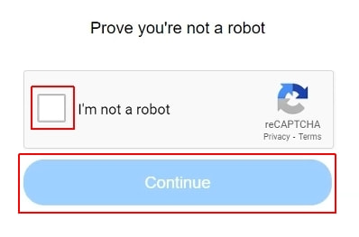 5. Sie sehen nun ein reCAPTCHA-Feld, in dem Sie nachweisen müssen, dass Sie kein Roboter sind. Klicken Sie dazu mit der Maus auf das kleine Quadrat links und drücken Sie dann Continue (Weiter), nachdem sich diese Schaltfläche tiefblau gefärbt hat.