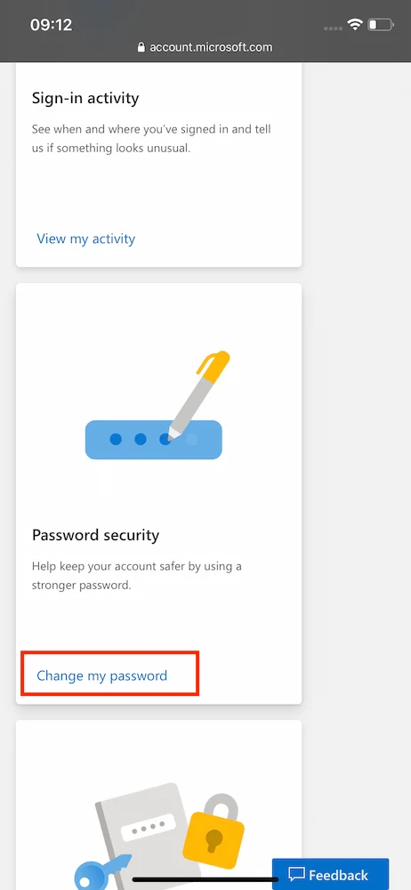 2. Wählen Sie Password security (Passwortsicherheit). Als Sicherheitsmaßnahme werden Sie möglicherweise aufgefordert, Ihre Identität mit einem Sicherheitscode zu bestätigen, der an Ihre E-Mail oder Ihr Telefon gesendet wird.