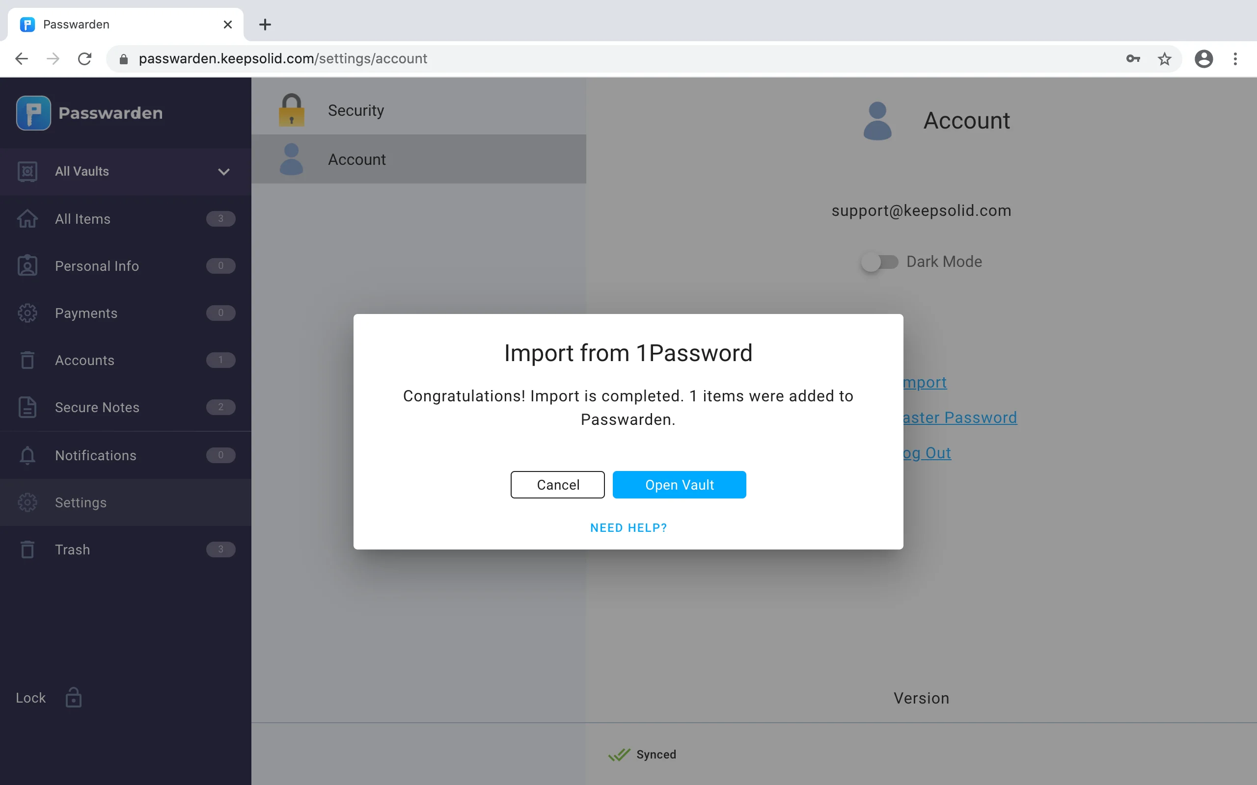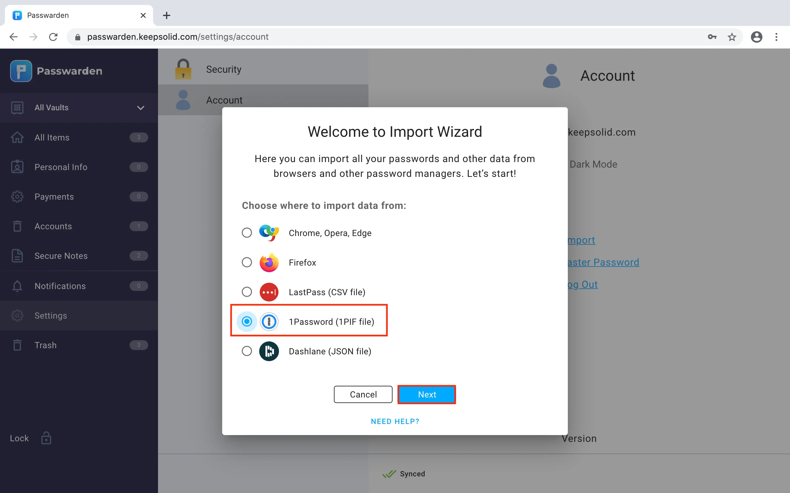 1. Öffnen Sie unseren Passwort-Manager und gehen Sie zu Einstellungen (Settings) > Konto (Account) > Importieren (Import).