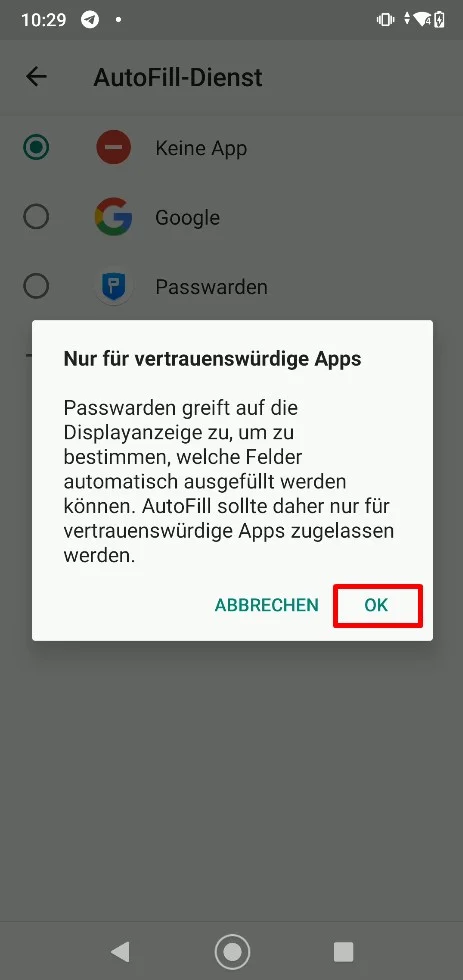 3. Wählen Sie Passwarden als Ihren primären Autofill-Dienst und tippen Sie auf OK.
