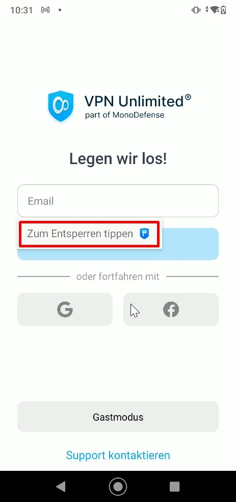 Hinweis: Die App VPN Unlimited wird als Beispiel genommen. Die Autofill-Funktion von Passwarden funktioniert reibungslos mit jeder Anwendung, die auf Ihrem Android-Gerät installiert ist.