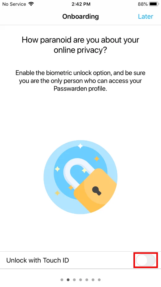 4. Si tu iPhone o iPad dispone de una función de desbloqueo biométrico, puedes iniciar sesión en Passwarden utilizando tu Touch ID en lugar de tu contraseña maestra. Para activar esta función, pulsa el botón de cambio junto a Unlock with Touch ID (Desbloquear con Touch ID).