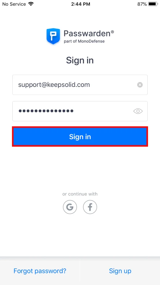 Si ya tienes un ID de KeepSolid, simplemente introduce tu dirección de correo electrónico y tu contraseña. A continuación, toca el botón Sign in (Iniciar Sesión). También puedes registrarte con tu ID de Apple, tu cuenta de Facebook o tu cuenta de Google.