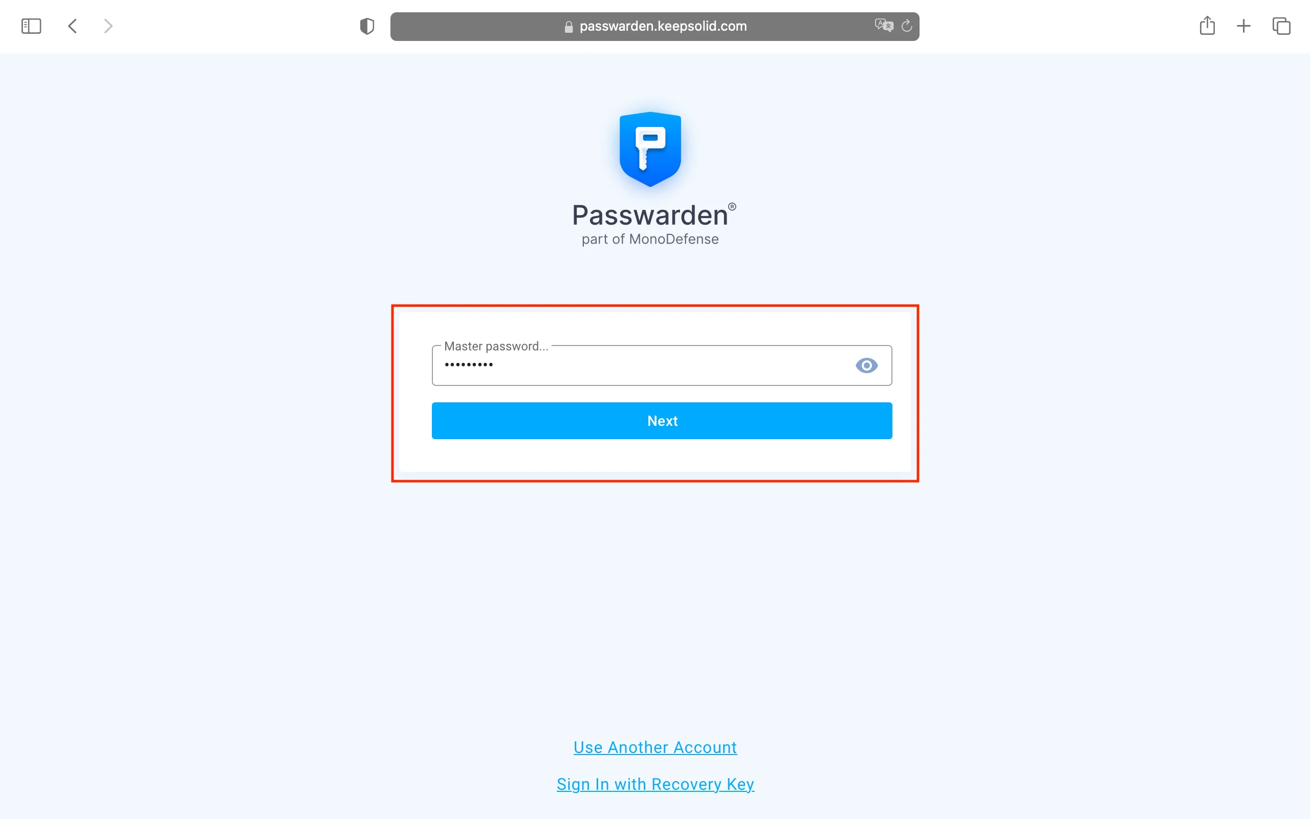1. マスターパスワードを使用して、Passwardenのアカウントにサインインします。