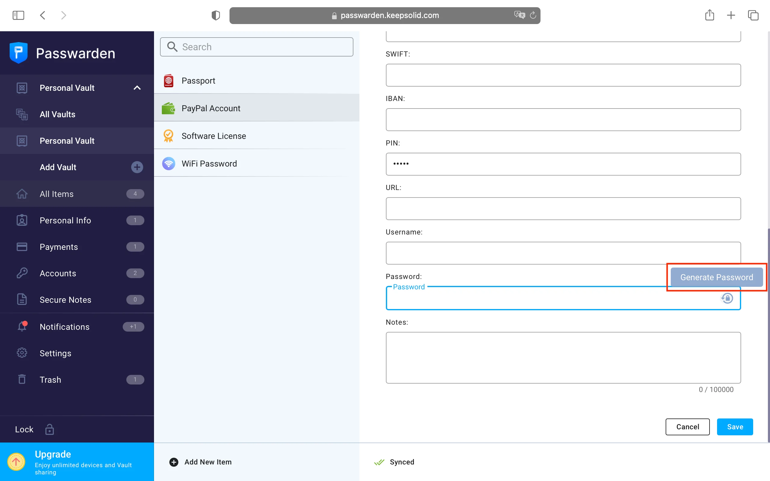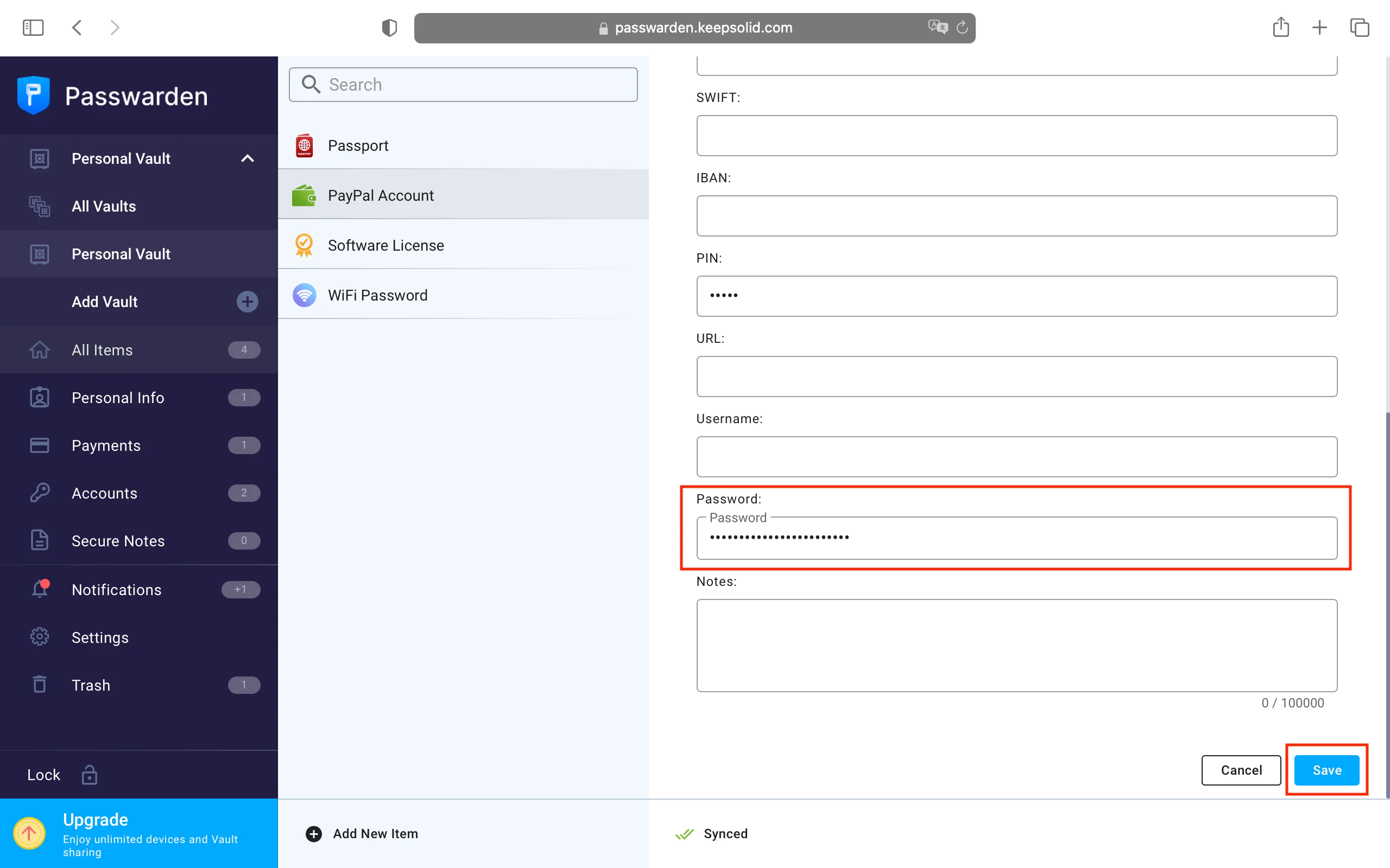 これで完了です。PayPalのパスワードが正常に更新され、Passwardenのストレージに保存されました。