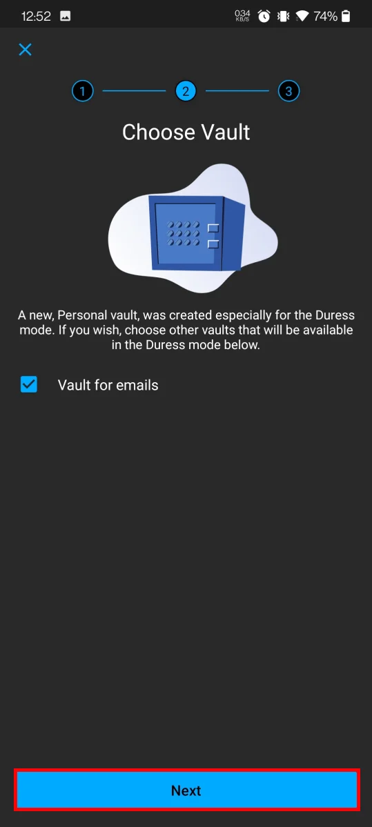 4. 緊急モードで表示させたいデータVaultを選択し、Next(次へ)をタップします。