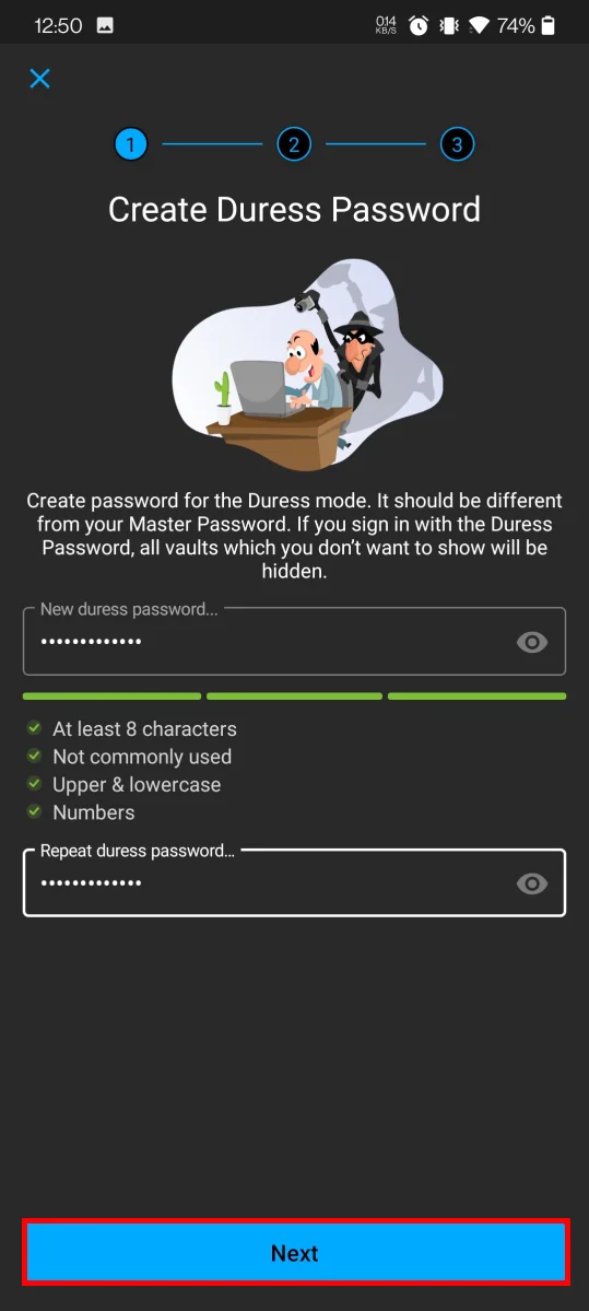 3. 緊急パスワードを作成し、確認します。その後、Next(次へ)をタップします。