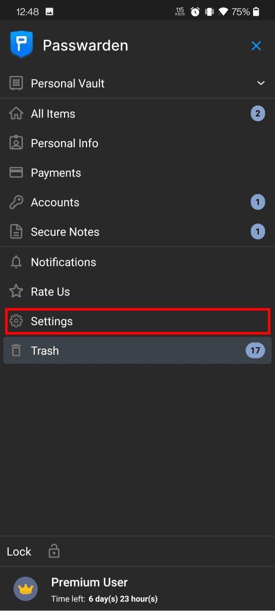 1. Passwardenアプリケーションにサインインし、Settings(設定)に進みます。