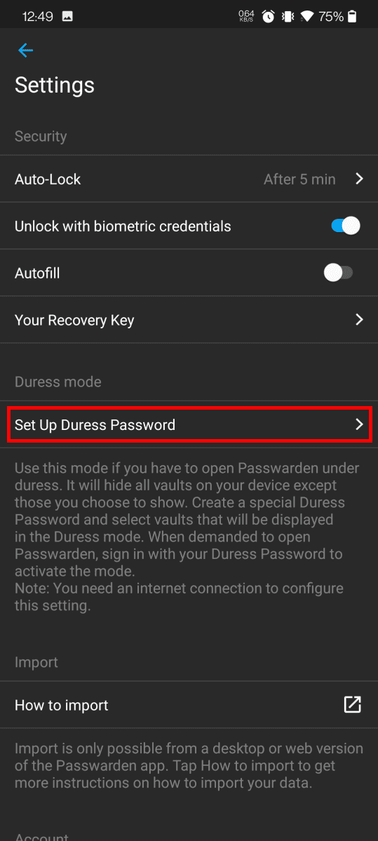 2. Duress Mode(緊急モード)セクションでSet Up Duress Password(緊急パスワードの設定)をタップします。