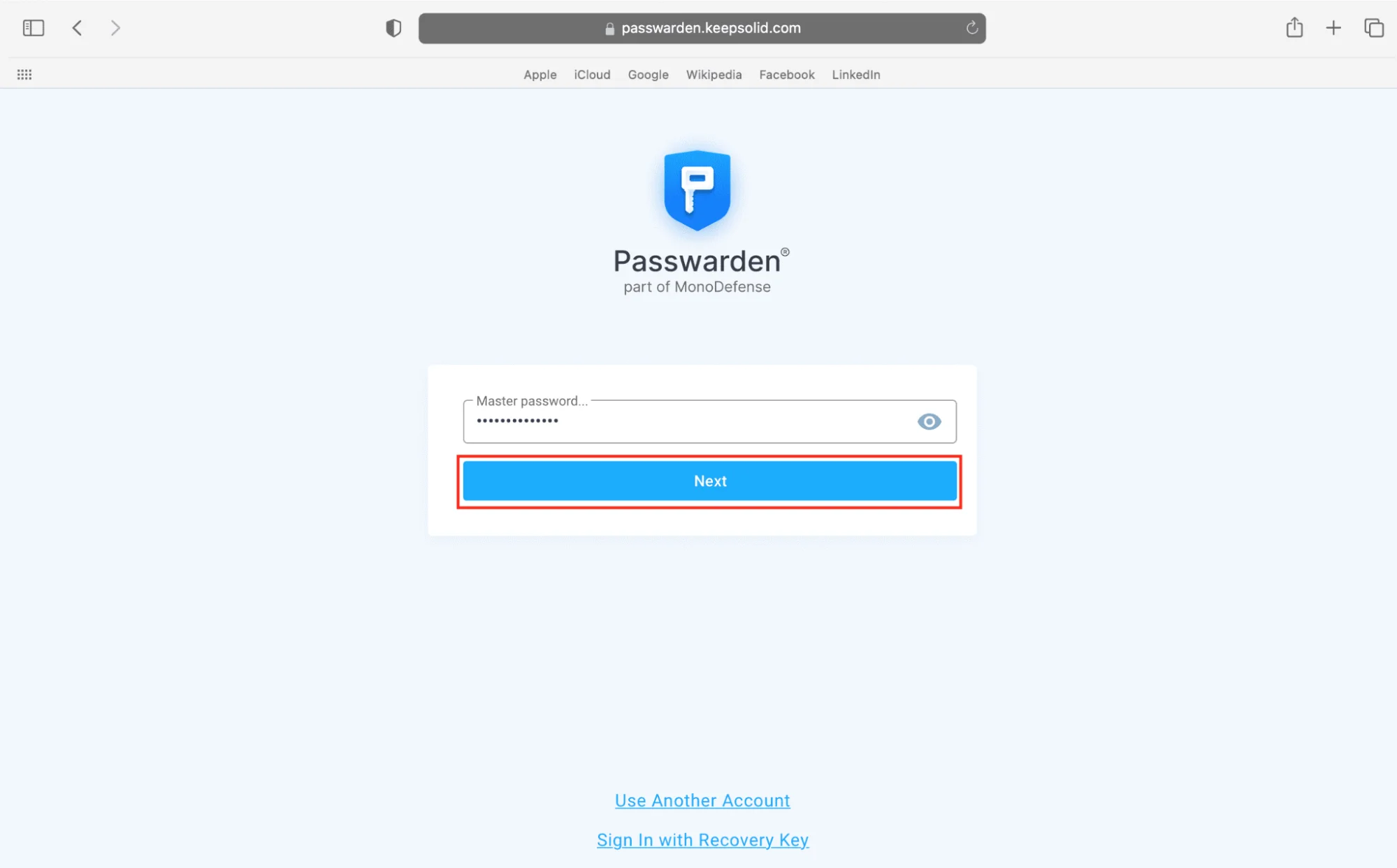 1. Войдите в учетную запись Passwarden, используя мастер-пароль.