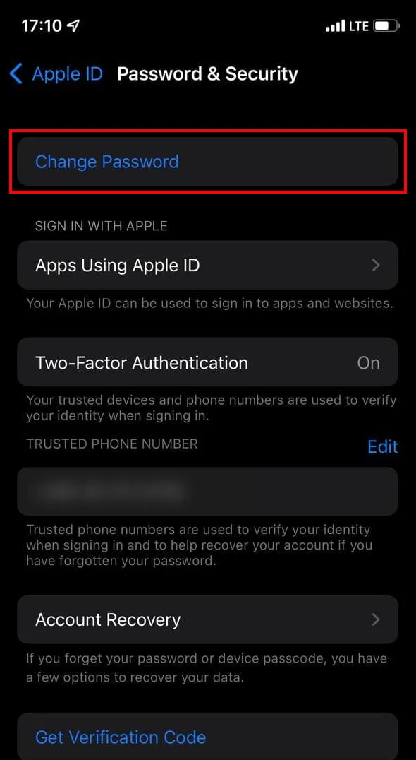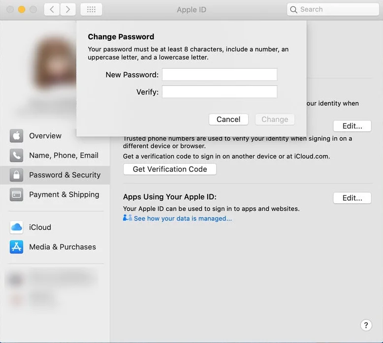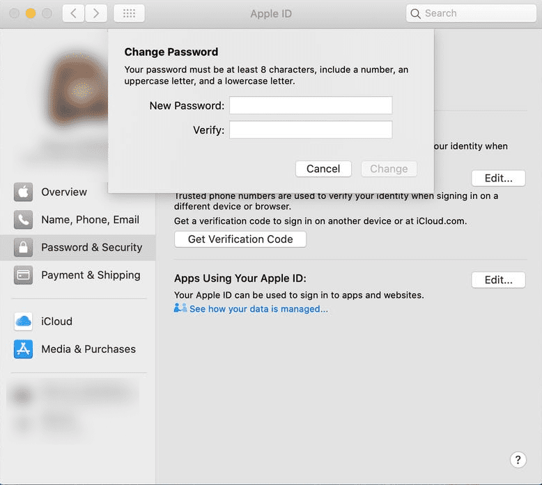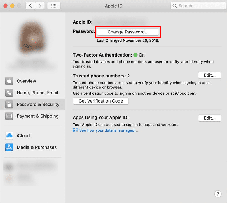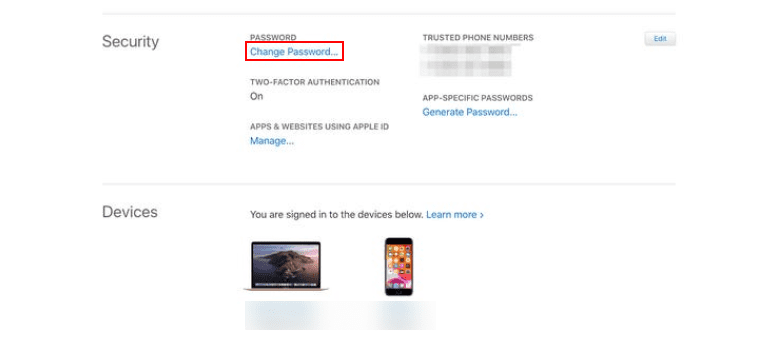 2. Gehen Sie in Ihrem ID-Bildschirm zu Password and Security (Passwort und Sicherheit). Klicken Sie dann auf Change Password (Passwort ändern).