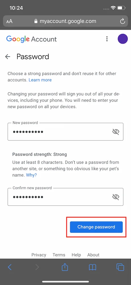 4. Geben Sie Ihren neuen Gmail-Passcode ein, bestätigen Sie ihn und tippen Sie auf Change Password (Passwort ändern).