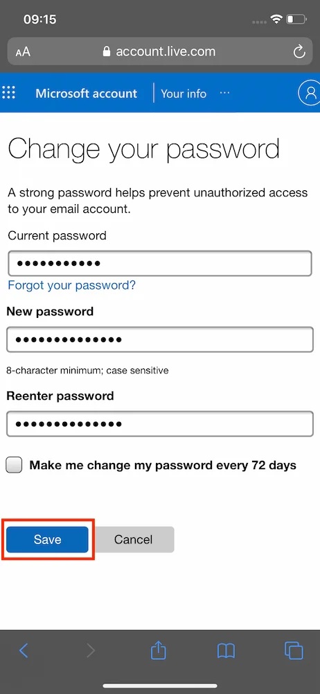 3. Geben Sie Ihren aktuellen Outlook-Passcode ein, richten Sie ein neues Passwort ein und tippen Sie dann auf Safe (Speichern).