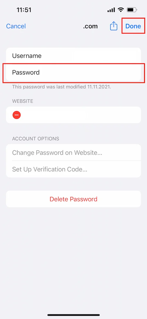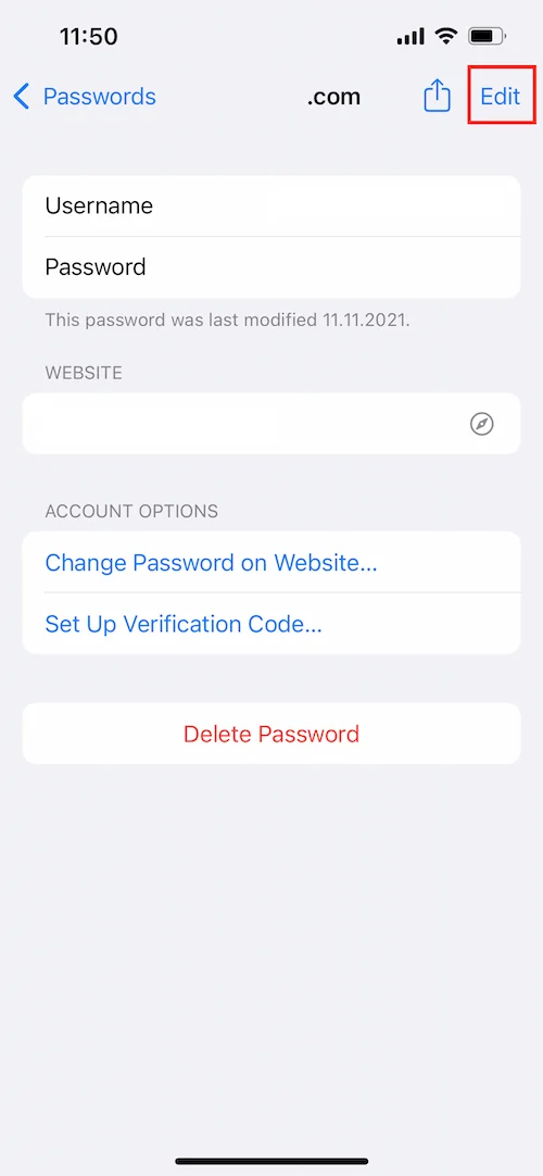 3. Klicken Sie oben rechts auf Edit (Bearbeiten) und ersetzen Sie Ihr aktuelles Passwort durch ein neues im Feld Password (Passwort).