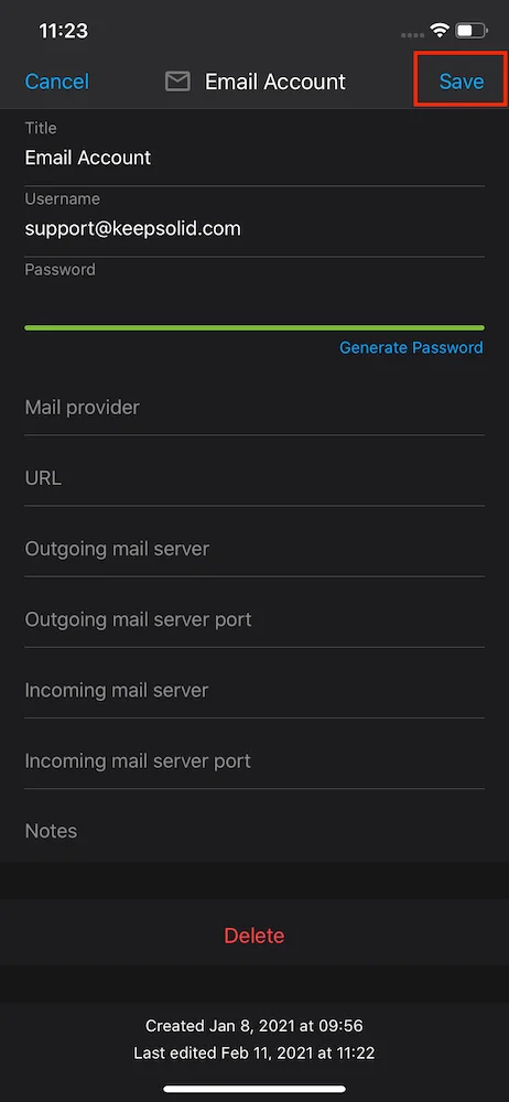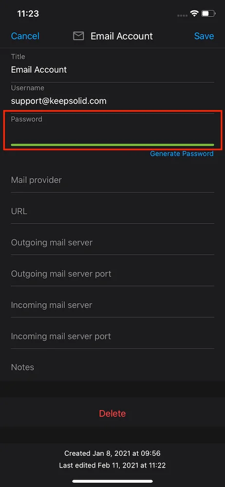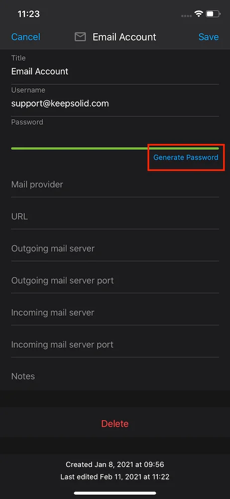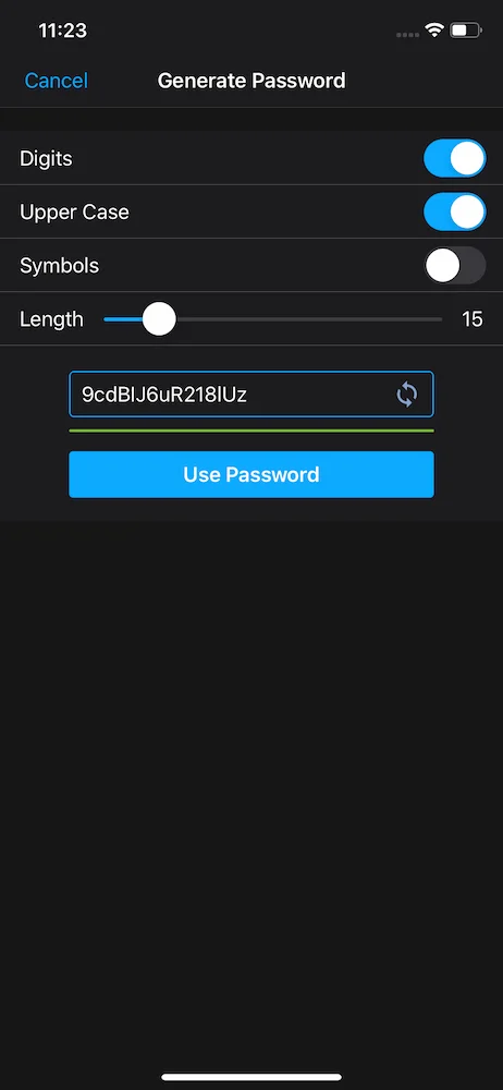 Um sicherzustellen, dass Ihr neues Passwort sicher ist, empfehlen wir Ihnen dringend, es nach dem Zufallsprinzip zu vergeben. Tippen Sie dazu neben dem Feld Password (Passwort) auf Generate Password (Passwort generieren) und befolgen Sie die Anweisungen auf dem Bildschirm.