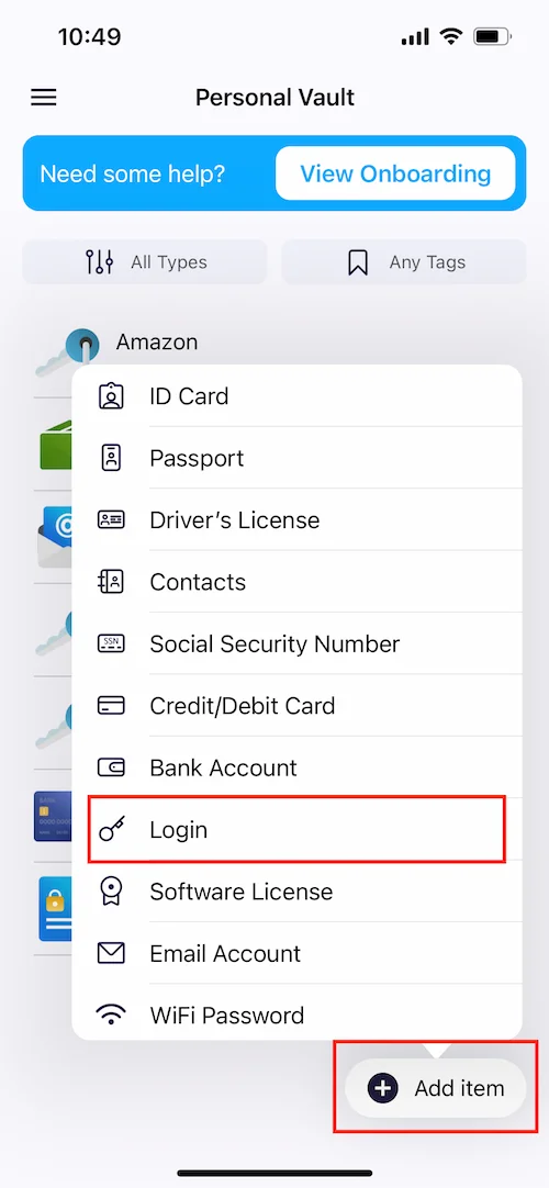 2. Um ein neues Element zu erstellen, klicken Sie auf die Schaltfläche Add Item (Element hinzufügen) und wählen Sie das erforderliche Element aus, z. B. Login.