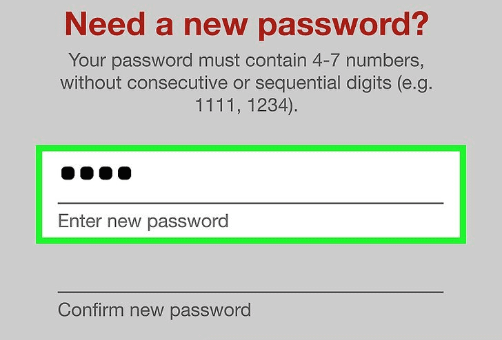 Beachten Sie, dass das Passwort zwischen 4 und 7 Stellen enthalten muss und die Zahlen keine aufeinanderfolgenden oder sich wiederholenden Ziffern sein dürfen.