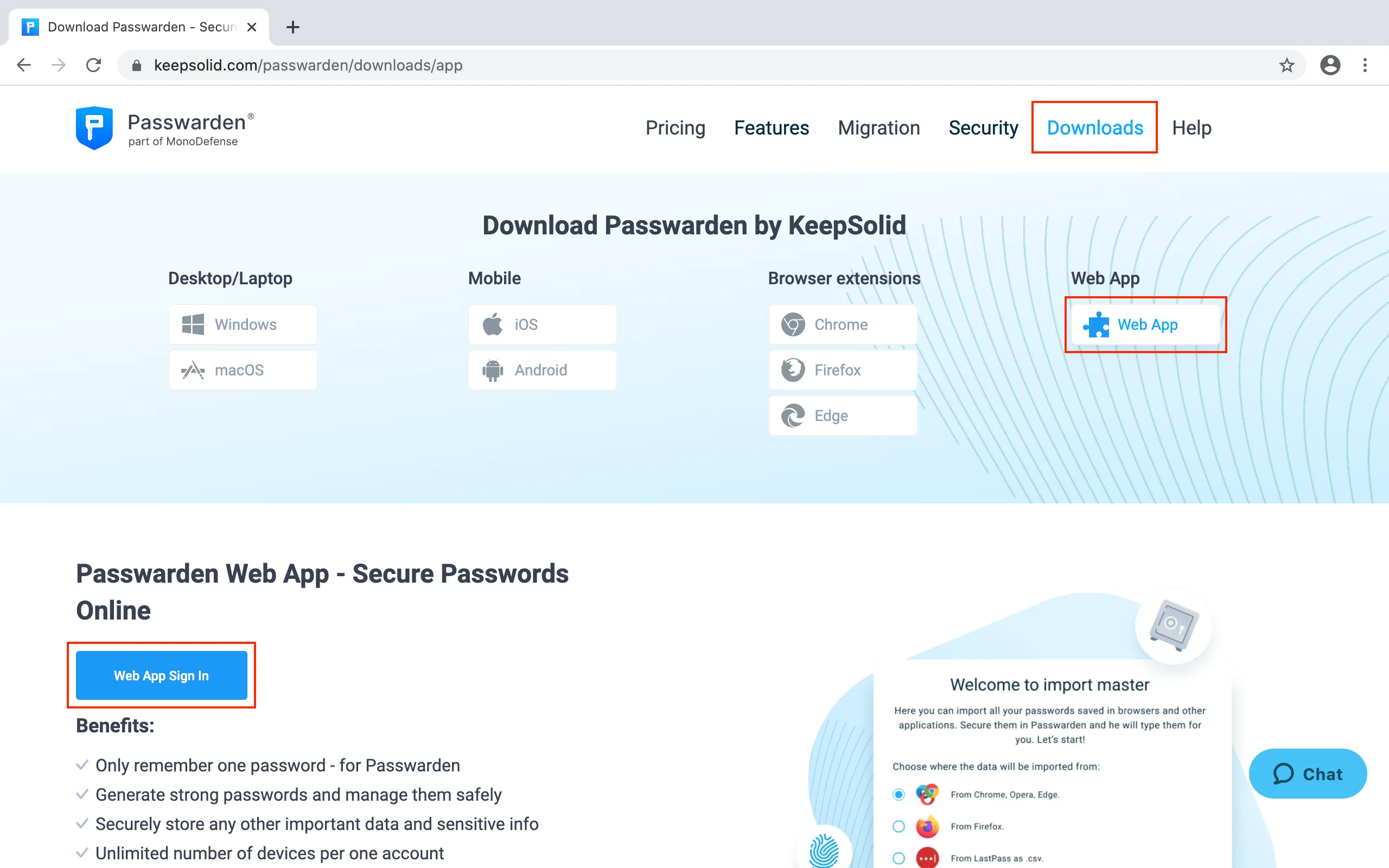 1. Öffnen Sie die Passwarden-Website, gehen Sie zu Downloads > Web App > klicken Sie auf die Schaltfläche Web App Anmeldung (Web App Sign In).