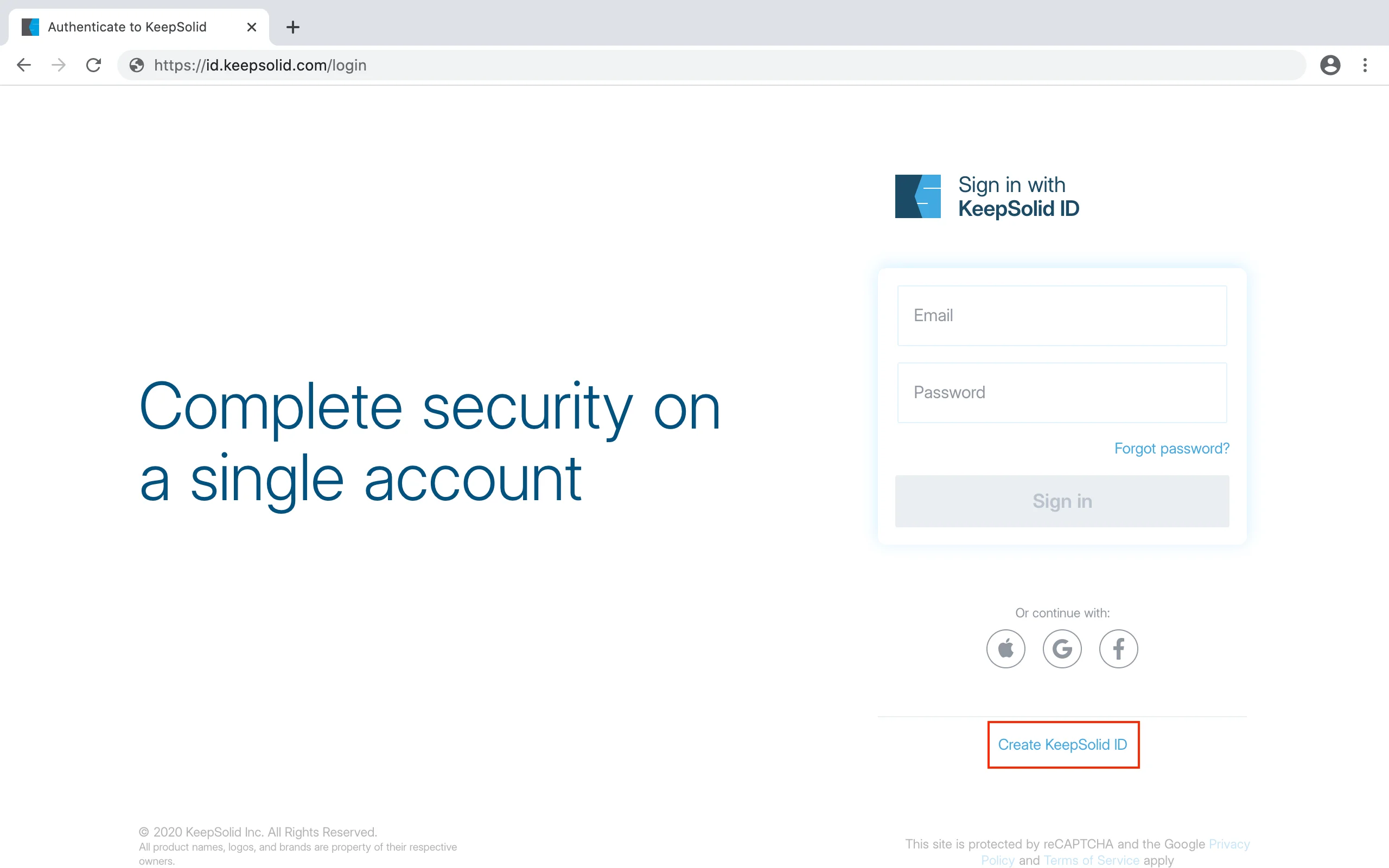 2. Wenn Sie bereits eine KeepSolid-ID haben, geben Sie Ihre E-Mail-Adresse und Ihr Passwort ein und drücken Sie Anmelden (Sign in). Sie können auch mit Ihrer Apple-ID, Ihrem Facebook- oder Google-Konto fortfahren.