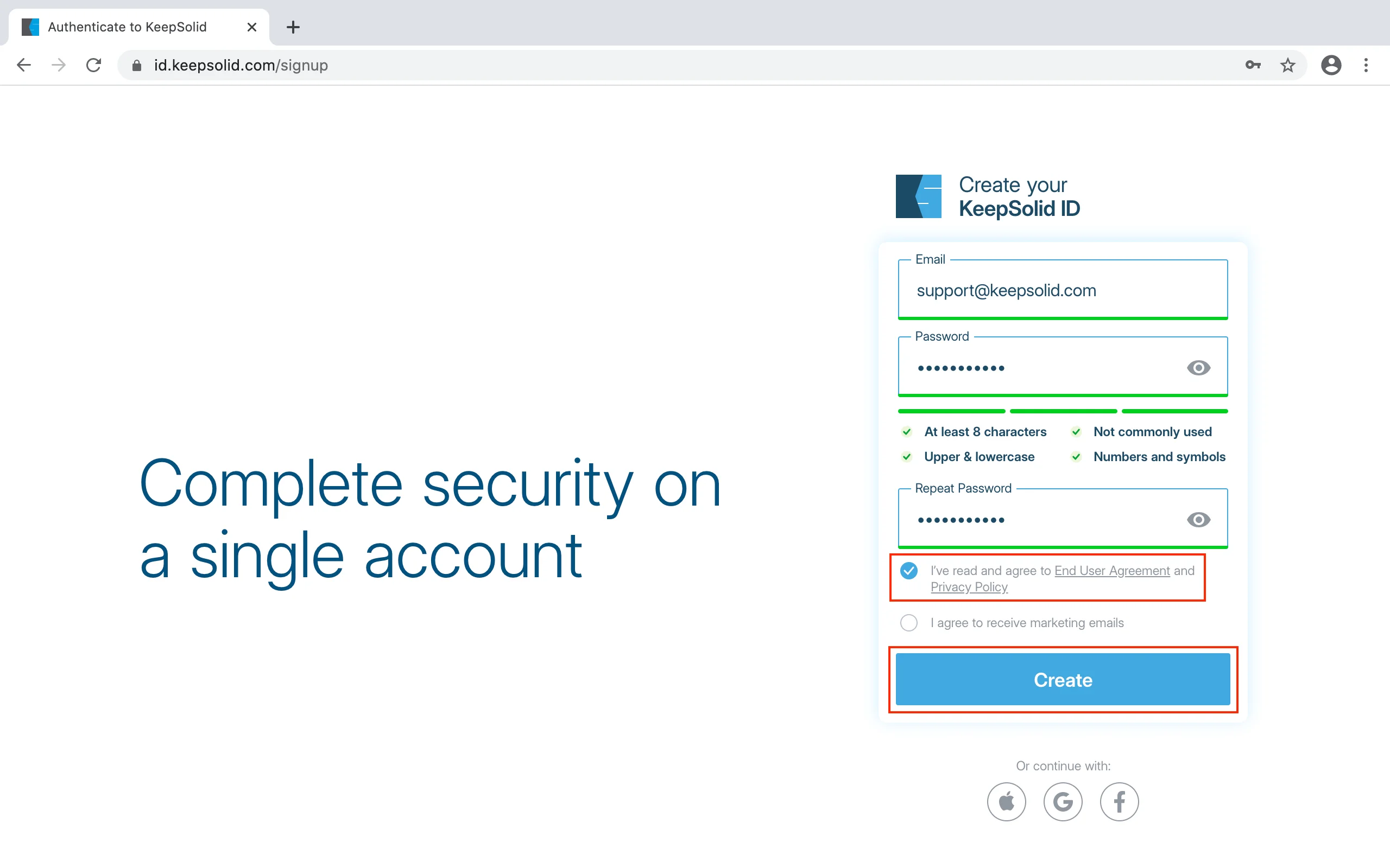 Wenn Sie keine KeepSolid-ID haben, sollten Sie eine neue erstellen. Drücken Sie dazu KeepSolid ID erstellen (Create KeepSolid ID). Geben Sie Ihre E-Mail-Adresse und Ihr Passwort ein. Bestätigen Sie das Passwort und aktivieren Sie das Kontrollkästchen neben Ich habe gelesen und stimme zu... (I’ve read and agree to...) Wenn Sie fertig sind, drücken Sie auf Erstellen (Create).