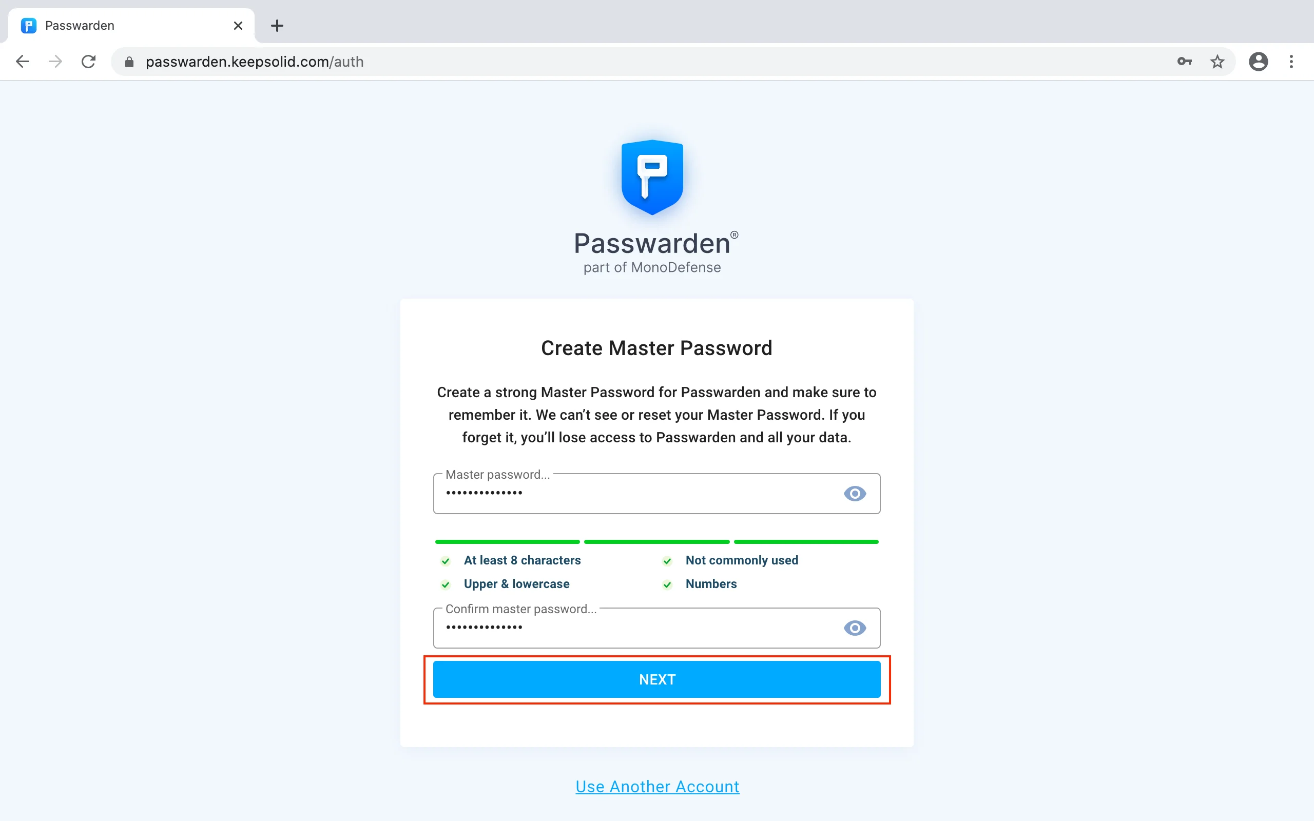 4. Jetzt sollten Sie Ihr Master-Passwort erstellen - ein Passwort aus Ihrem Passwarden-Konto. Bestätigen Sie es und tippen Sie auf Weiter (Next).