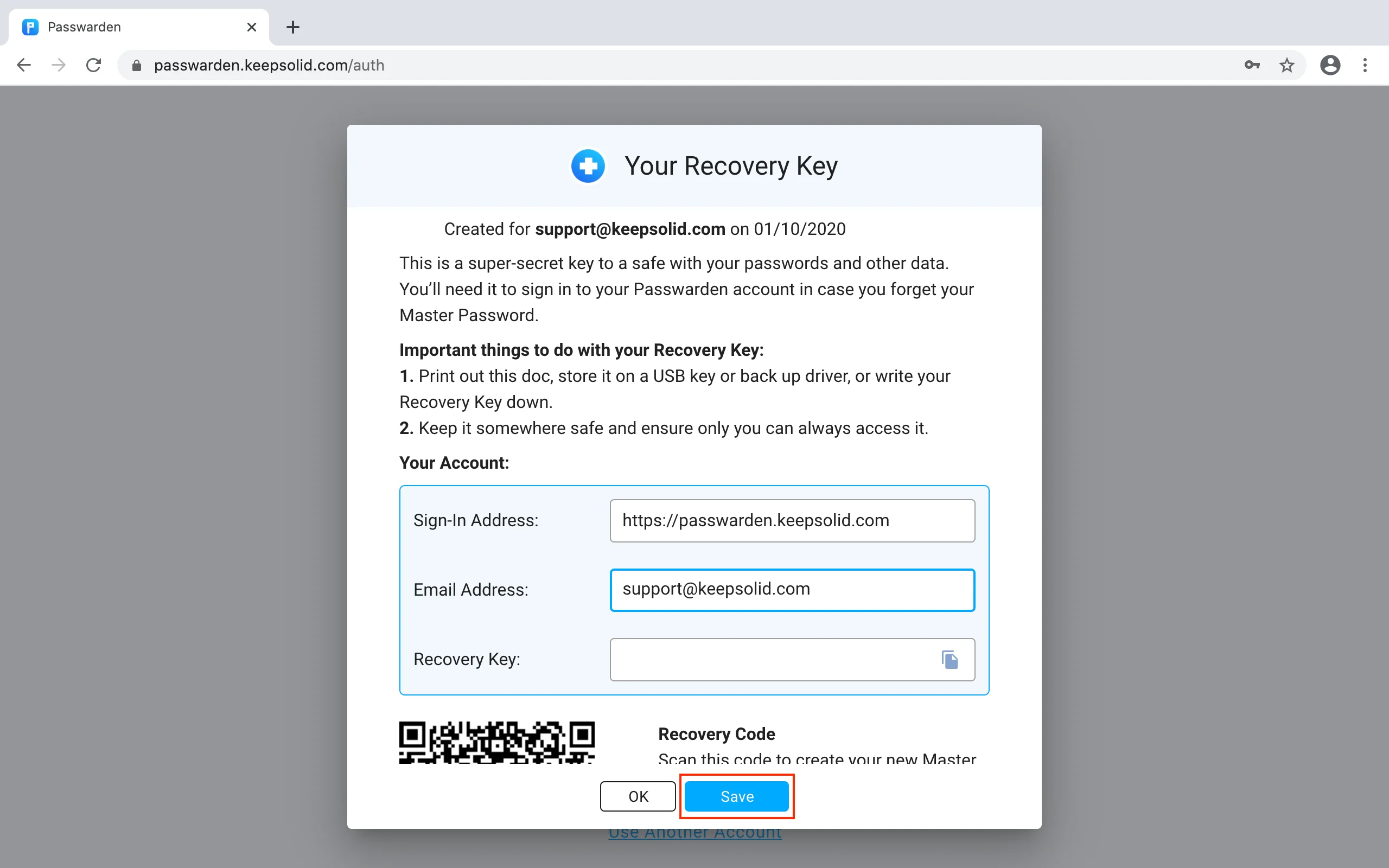 5. Hier ist Ihr Wiederherstellungsschlüssel. Drücken Sie Speichern (Save), um diese Datei herunterzuladen. Klicken Sie dann auf OK.