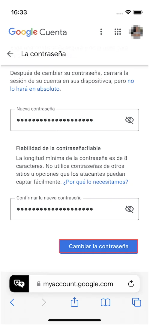 4. Ingresa tu nueva contraseña de Gmail, confírmala y pulsa Change password (Cambiar contraseña).