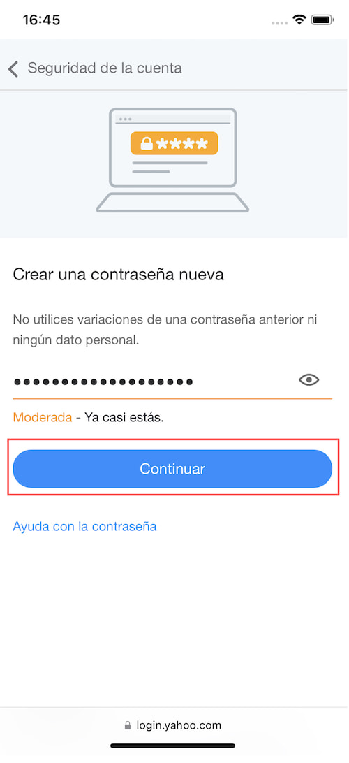 3. Ingresa tu nueva contraseña de Yahoo y toca Continue (Continuar).