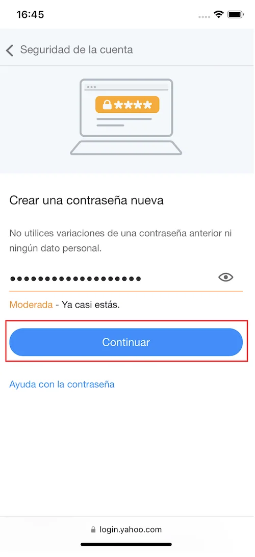 4. ¡Y eso es todo! Has creado con éxito tu nueva contraseña de Yahoo. Ahora toca en Continue (Continuar).