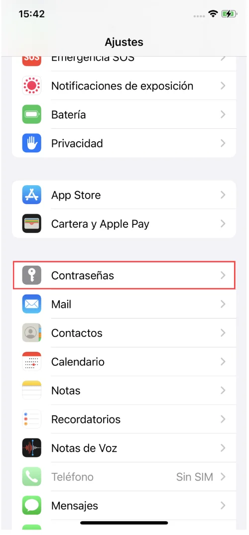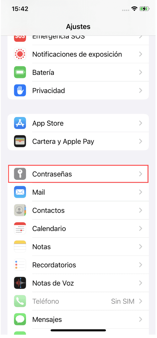 1. Abre los Settings (Ajustes) de tu iPhone y desplázate hacia abajo hasta la pestaña Passwords (Contraseñas).