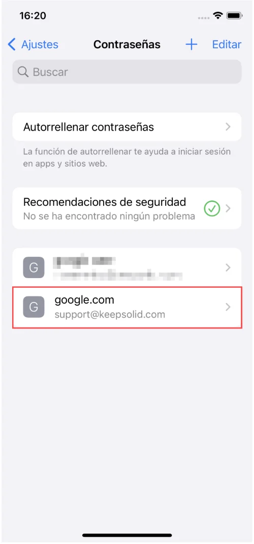 2. Selecciona la dirección de correo electrónico que deseas actualizar de la lista de contraseñas guardadas.