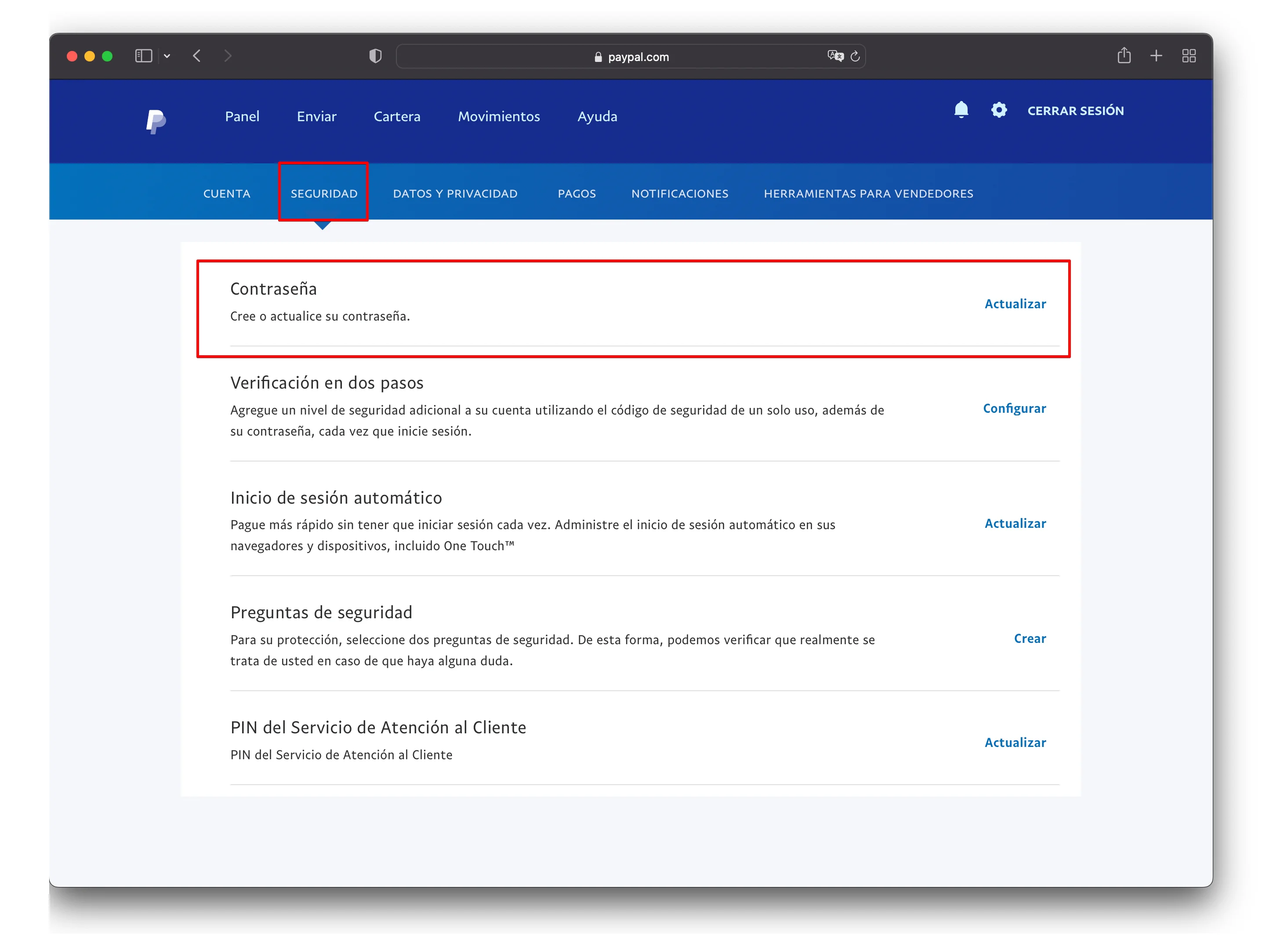 1. Inicia sesión en tu cuenta de PayPal y dirígete a la página de Security (Seguridad) - https://www.paypal.com/myaccount/security/