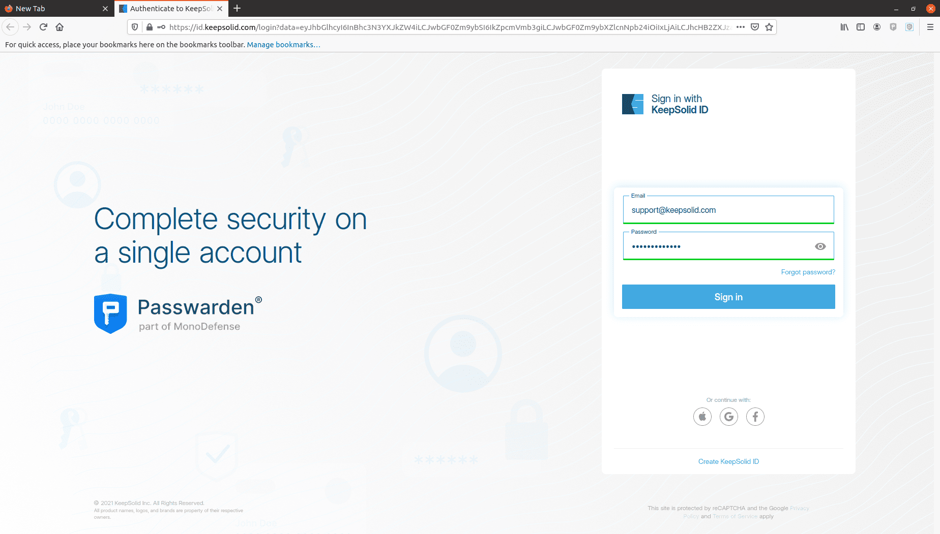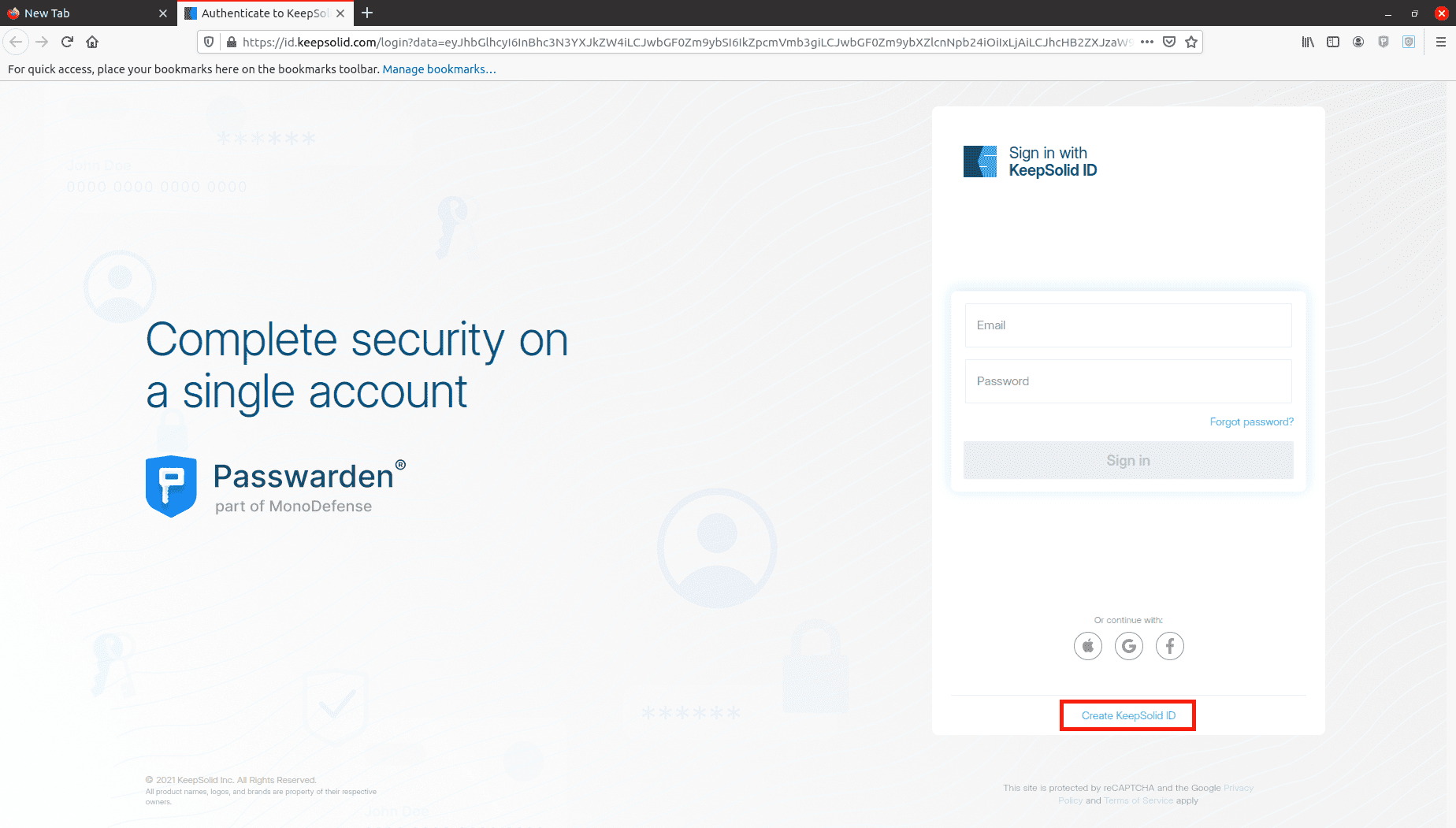 4. Después de hacer clic en el icono de Passwarden, serás redirigido a la página de inicio de sesión de KeepSolid. Ahora puedes iniciar sesión en la extensión de Firefox con tu ID de KeepSolid.