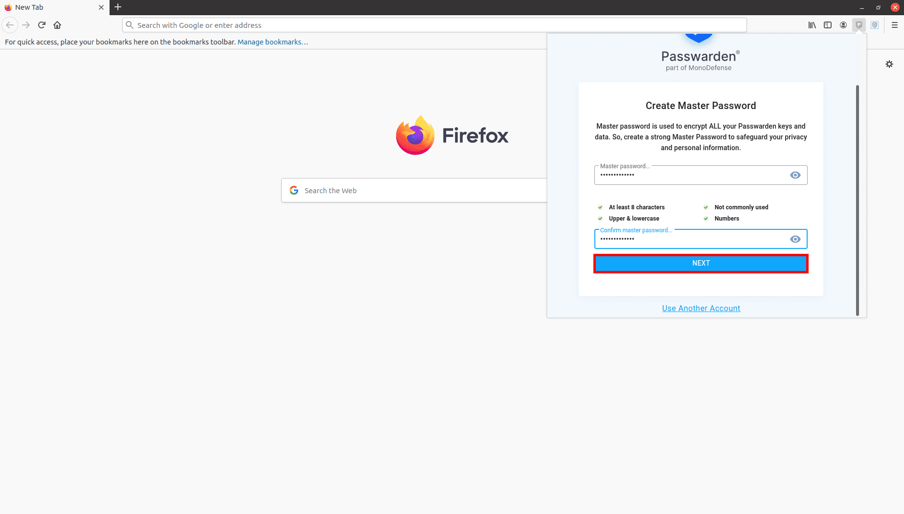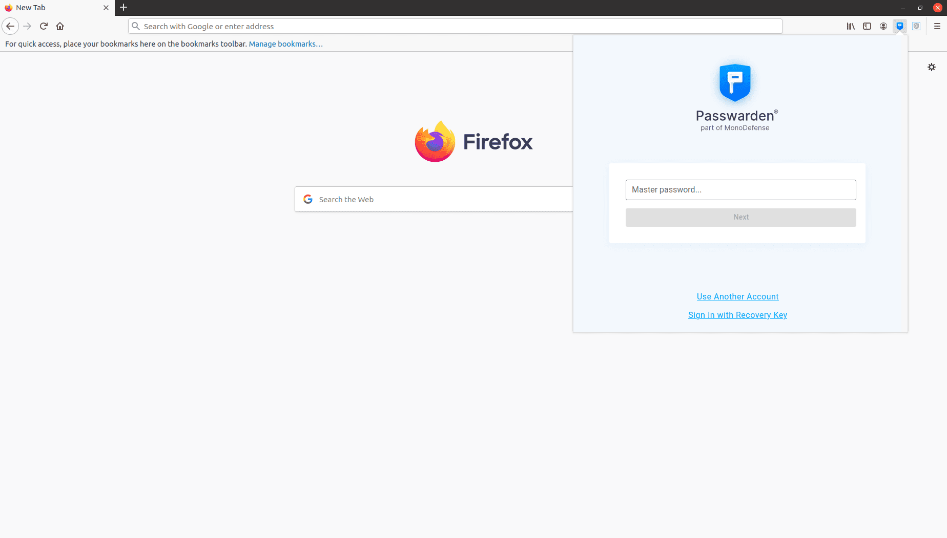 9. ¡Muy bien! Ahora solo tienes que abrir la extensión de Passwarden para Firefox y desbloquearla usando tu Master Password (Contraseña Maestra).