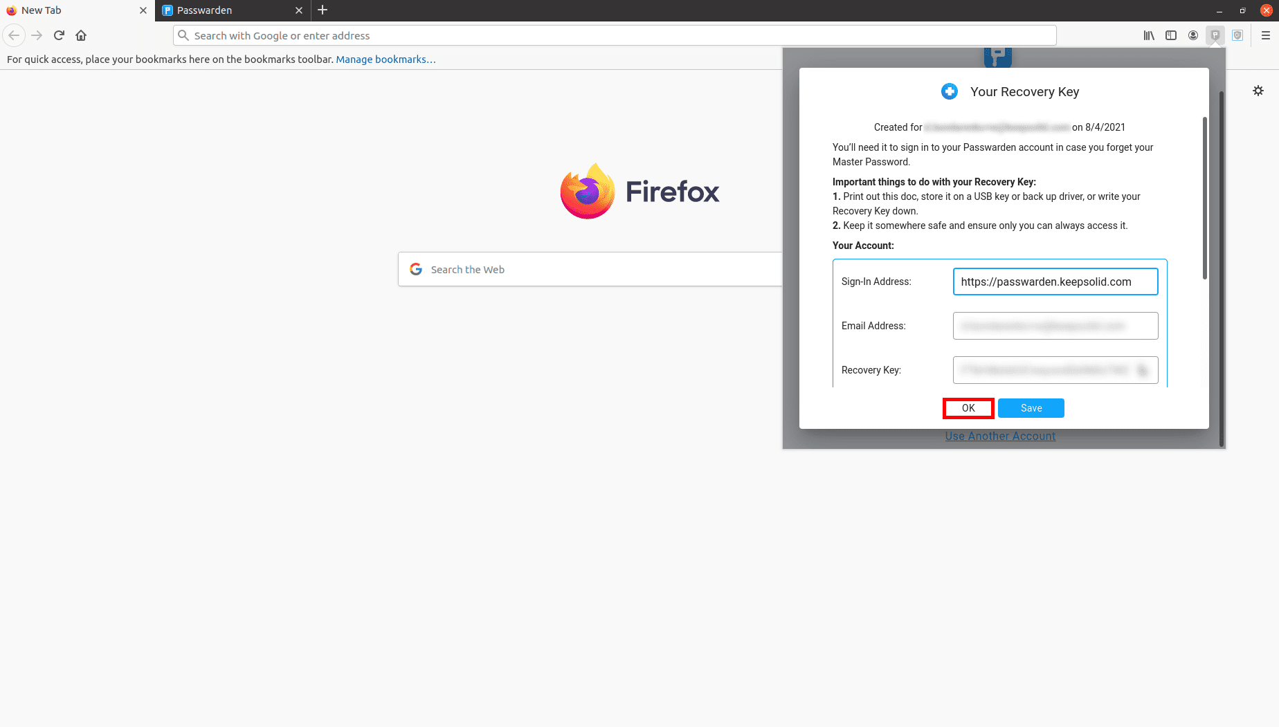 8. A continuación obtendrás tu Recovery Key (Clave de Recuperación). Asegúrate de guardarla. Después de esto, pulsa OK.