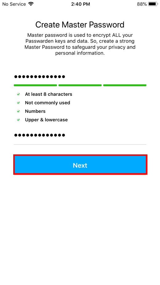 2. El siguiente paso es crear tu Contraseña Maestra. Para ello, configúrala y confírmala. Una vez terminado el proceso, pulsa Next (Siguiente).