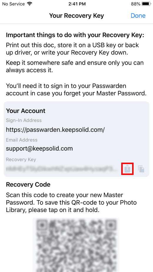 Pulsa el ícono de Save (Guardar) y asegúrate de no perderla nunca. Después de guardar tu Clave de Recuperación, pulsa Done (Hecho).