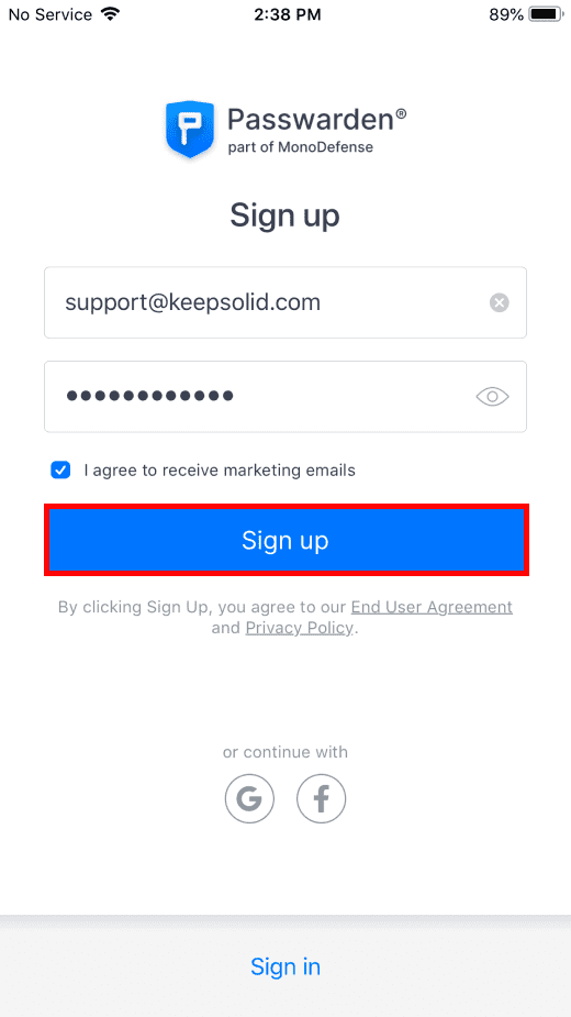 Para crear un nuevo ID de KeepSolid, pulsa en Sign up (Registrarse). Escribe tu correo electrónico, tu contraseña y marca la casilla de I agree to receive marketing emails (Acepto recibir ofertas por correo electrónico). A continuación, pulsa el botón Sign up (Registrarse).