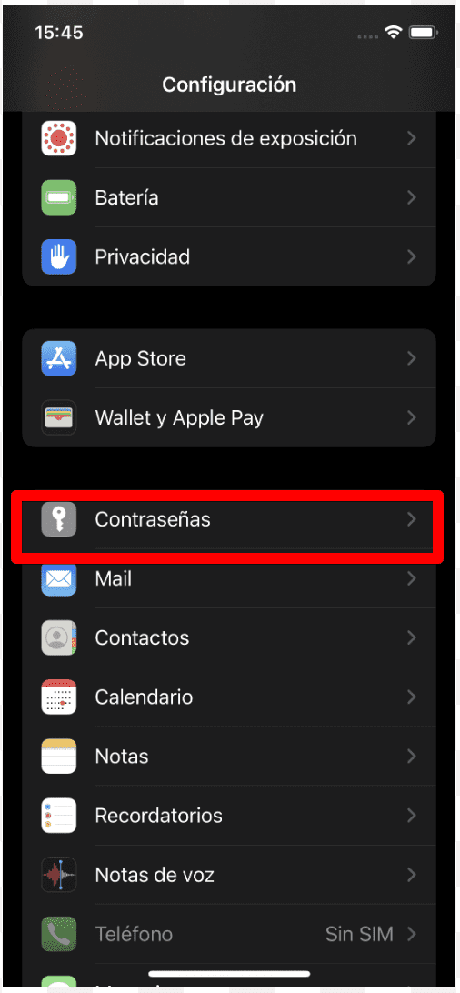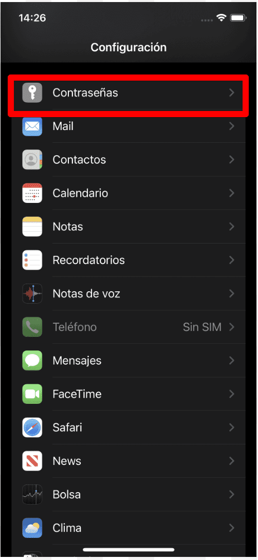 Abre la pestaña de Passwords & Accounts (Cuentas y Contraseñas) o Passwords (Contraseñas). El nombre puede variar según la versión de iOS.