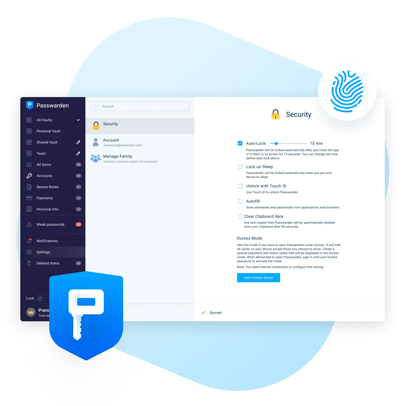 Notre gestionnaire de mots de passe en ligne permet une authentification à deux facteurs. Passwarden dispose de deux étapes d'authentification: KeepSolid ID et un code d'accès sur votre dispositif. Pour avoir accès à l'application, vous devez saisir les deux.