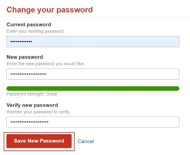 5. Enter your new combination (you need to do it twice) and type in your current one (only once). The system automatically assesses the strength of your new password. To make it truly hack-proof, follow the instructions you will find in our comprehensive guide. Click on the Save New Password button.