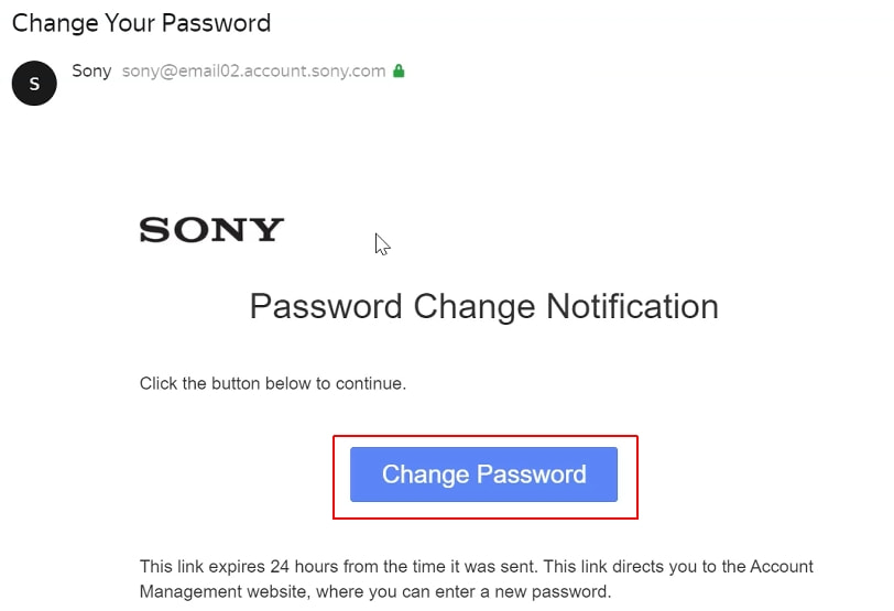 5. Allez dans votre messagerie et ouvrez le mail envoyé par SONY. Son objet doit être "Modifier votre mot de passe". Une fois que vous avez ouvert le courrier électronique, cliquez sur le bouton Change Password (Modifier le mot de passe).