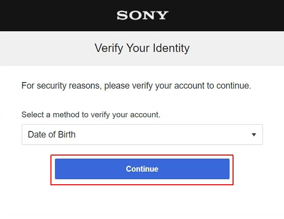 6. Il vous est maintenant demandé de vérifier votre identité. Lorsque vous avez enregistré votre compte PSN, vous avez fourni votre date de naissance; vous devez maintenant entrer ces mêmes données. Cliquez sur Continue (Continuer).