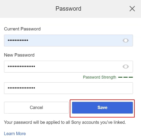 6. Saisissez votre mot de passe PSN actuel (une fois), puis tapez le nouveau (vous devez le faire deux fois). Le PSN évaluera automatiquement la force de la combinaison. Pour créer une séquence de symboles vraiment incassable, veuillez utiliser notre guide détaillé. Lorsque vous avez terminé, cliquez sur Save (Sauvegarder).