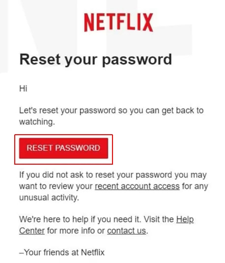 4. Go to your email box and open the letter sent by Netflix. Its subject should be “Reset your password”. Once you’ve opened the email, press the Reset password button.
