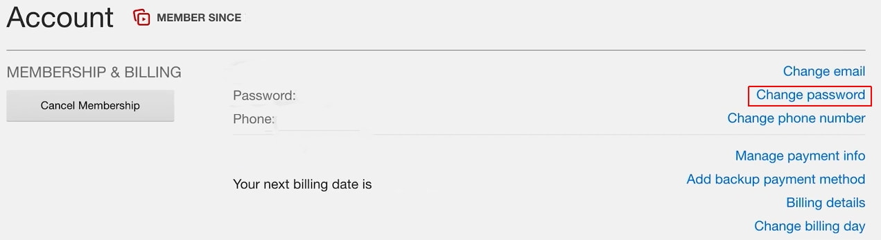 3. You now see the submenu that allows you to manage your Netflix account. Select Change password: it is on the right side of the Membership & Billing section.