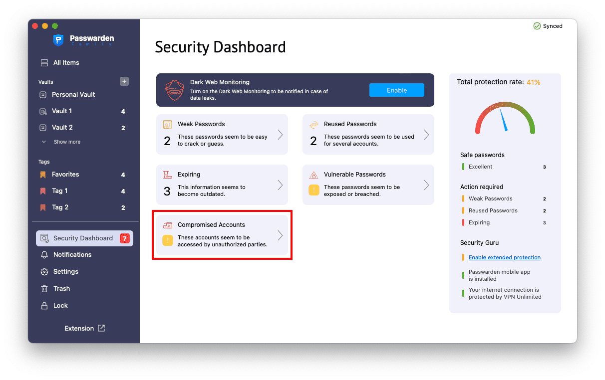 4. Go to Security Dashboard and find the Compromised Accounts category. To turn on the statistics in this category you need to confirm the Extended Protection Alert or enable the Dark Web Monitoring on the bar above.