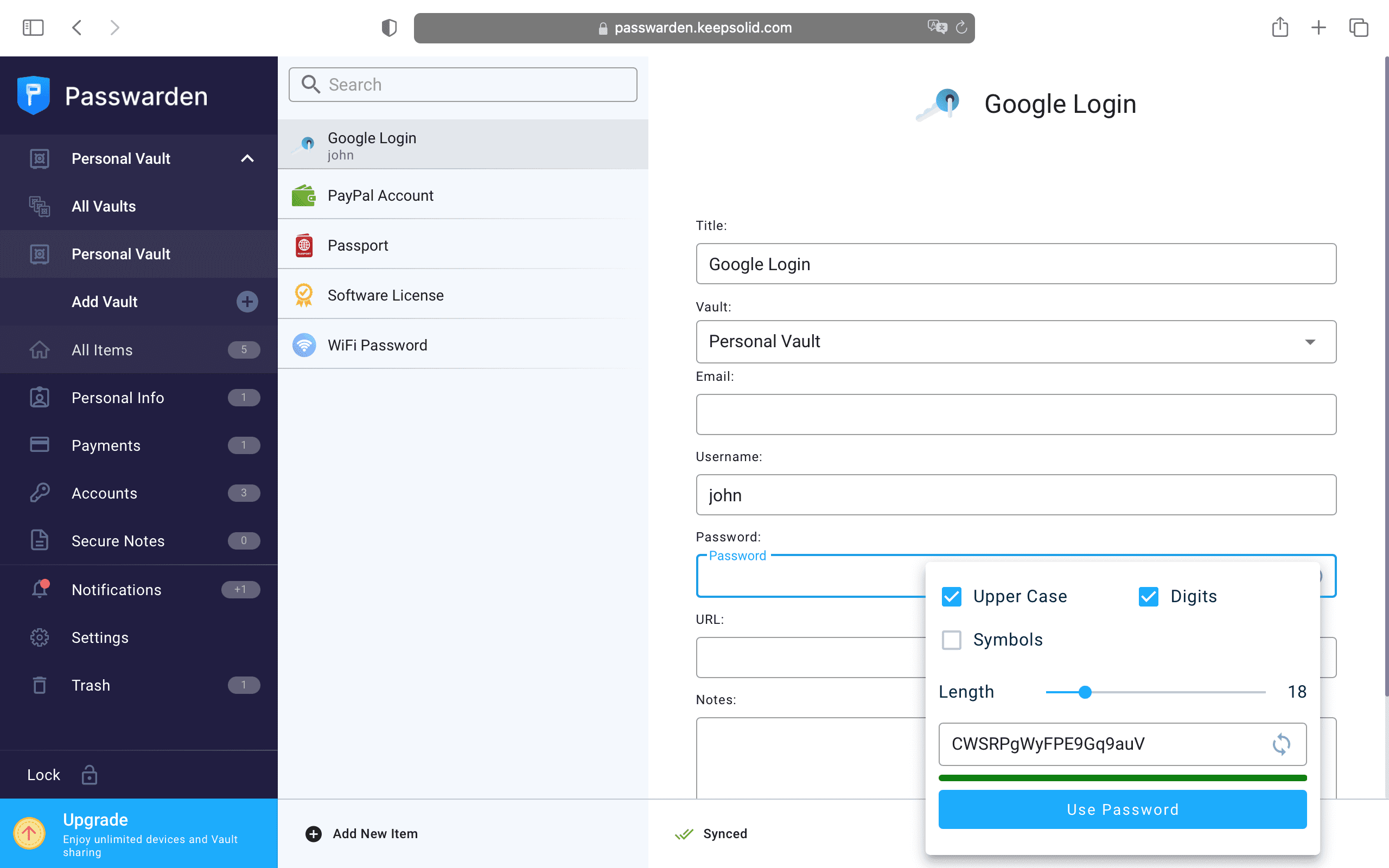 Passwardenアプリで強力なYouTubeパスコードを作成し、暗号化されたストレージを使用して安全に保存します。