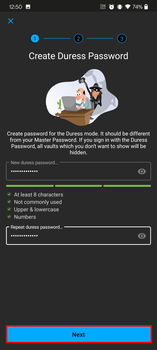 3. 緊急パスワードを作成し、確認します。その後、Next(次へ)をタップします。
